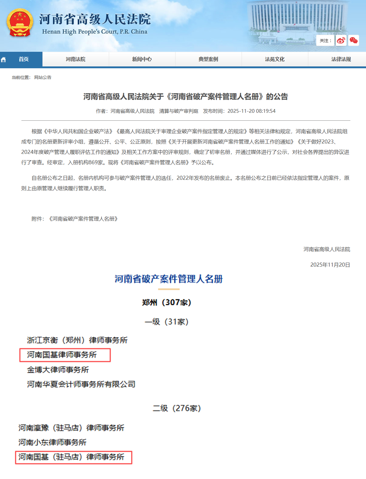17、11月20日,河南省高级人民法院正式公布《河南省破产案件管理人名册》,河南国基律师事务所荣获破产案件一级管理人资质,成功入选“河南省破产案件一级管理人名册”,河南国基(驻马店)律师事务所入选“河南省破产案件二级管理人名册”。