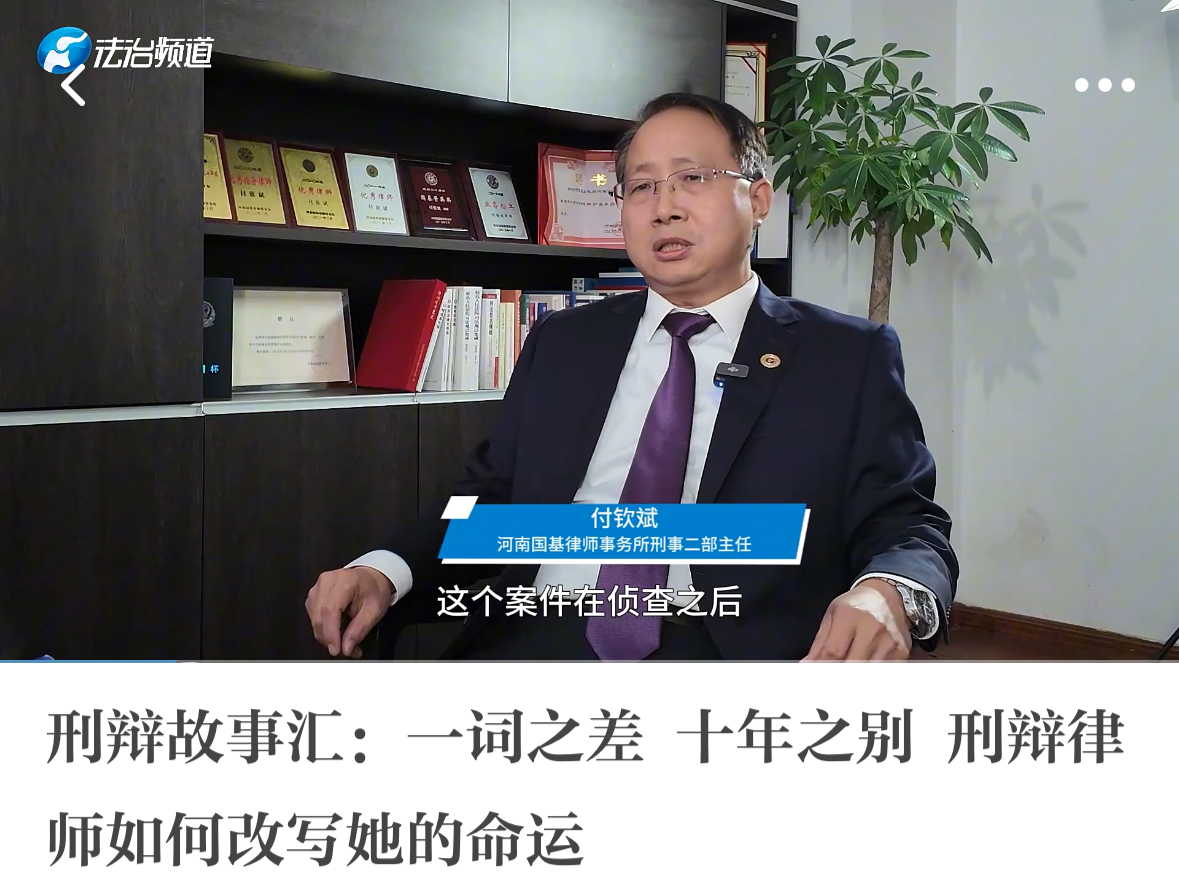 24、11月30日,河南电视台法治频道采访报道河南国基律师事务所刑事二部主任付钦斌律师办案纪实,拍摄制作的节目《刑辩故事汇:一词之差 十年之别 刑辩律师如何改写她的命运》在法治频道播出。