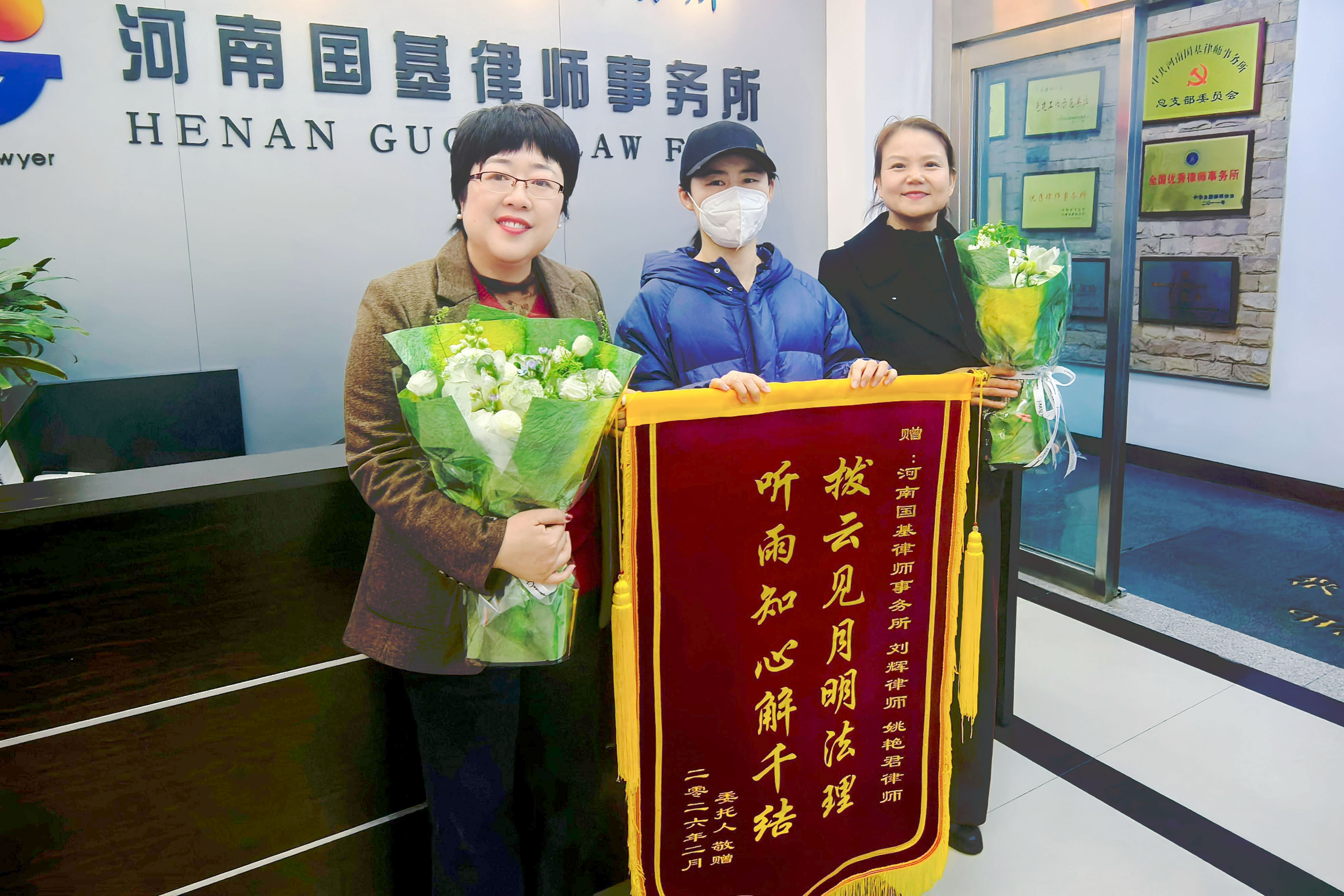 1、3月2日,河南国基律师事务所婚姻家事与财富传承部主任刘辉、副主任姚艳君律师收到委托人送来的锦旗与鲜花。两位律师代理的一起离婚纠纷案历经一审、二审,经郑州市中院调解,双方达成一致,夫妻共同财产房屋出资款一次性支付给委托人,案件圆满办结。