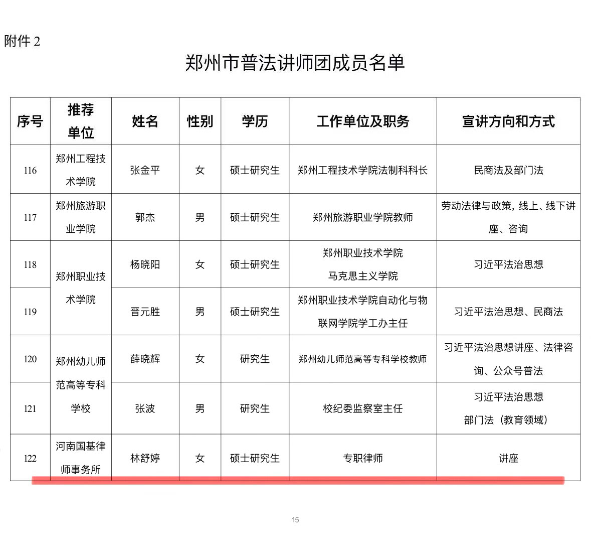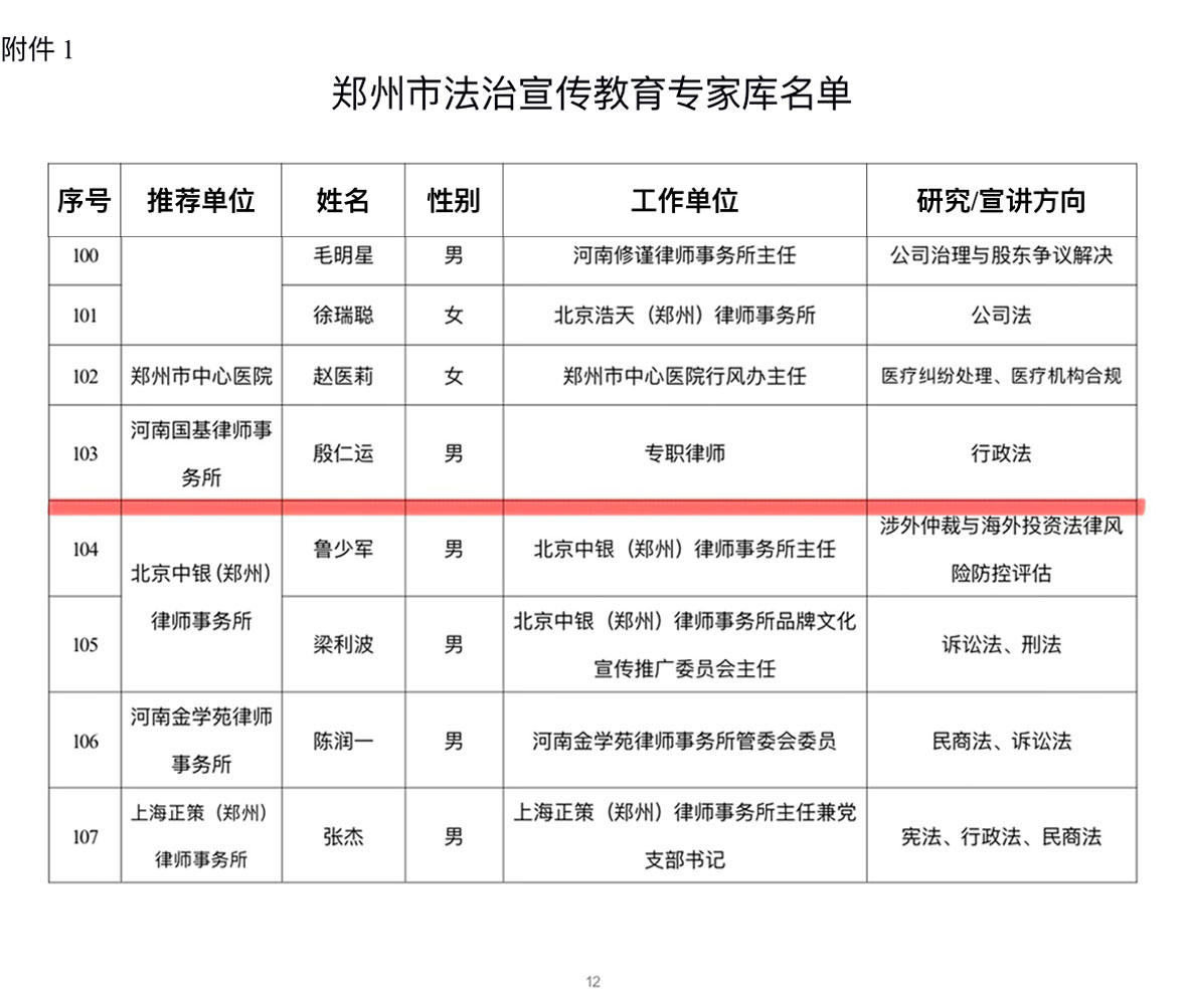 19、3月26日,河南国基律师事务所行政与政府法律顾问部主任殷仁运律师入选“郑州市法治宣传教育专家库”,林舒婷律师入选“郑州市普法讲师团成员库”。
