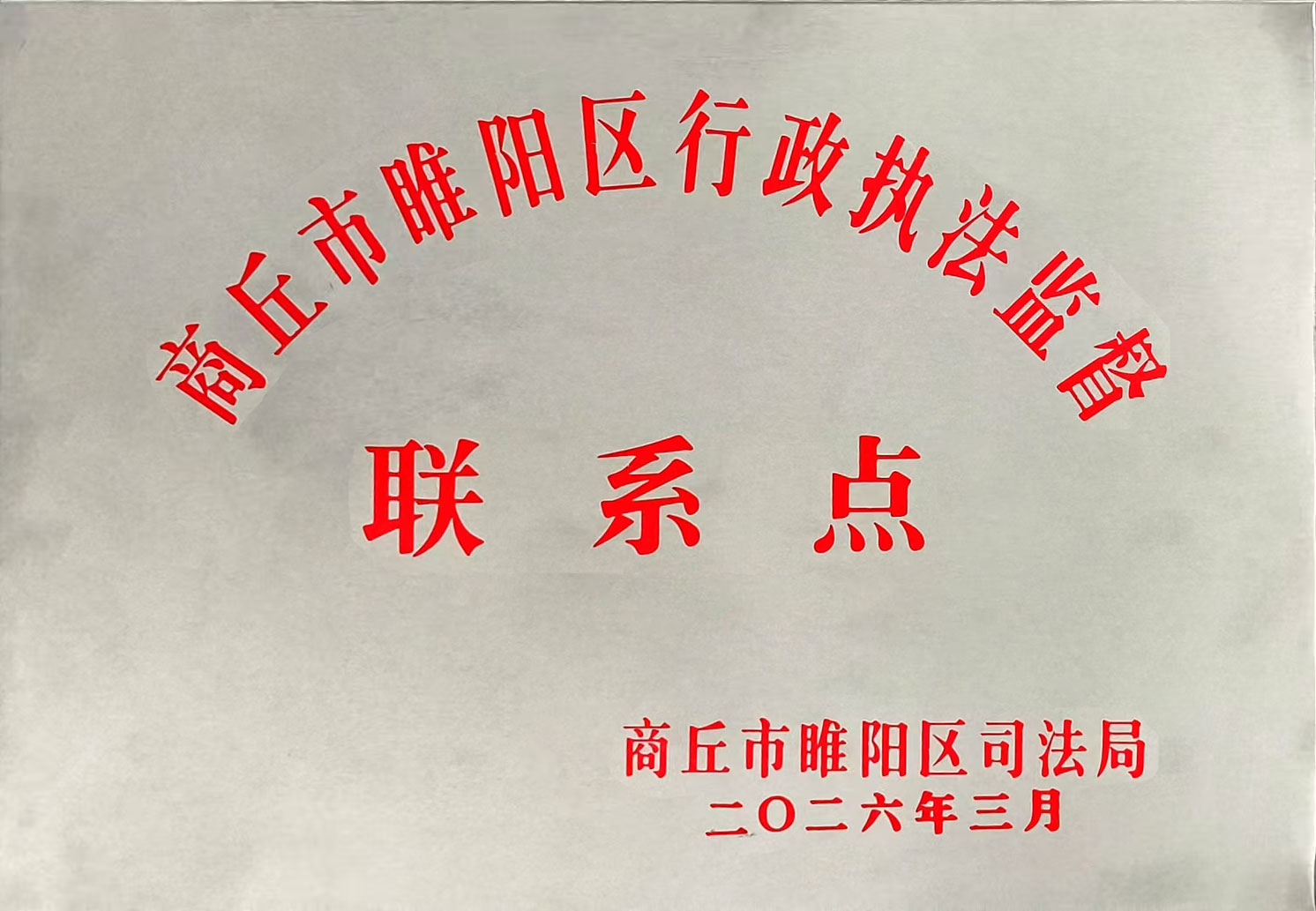 3、4月8日,河南国基(商丘)律师事务所被商丘市睢阳区司法局设立为行政执法监督联系点,李起升、白治国、单保刚三位律师受聘为睢阳区行政执法监督员,为睢阳区法治建设及高质量发展贡献力量。