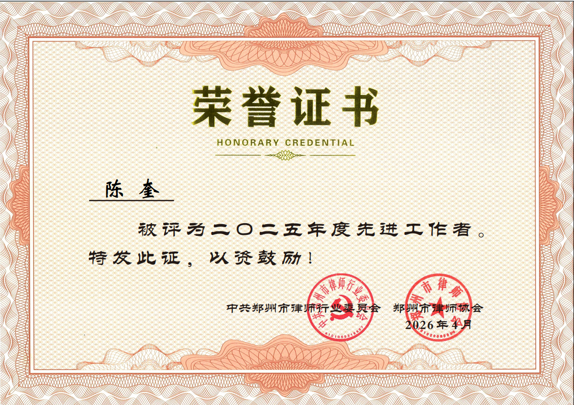 10、4月17日,河南国基律师事务所刑事二部主任付钦斌律师、知识产权部主任陈奎律师被中共郑州市律师行业委员会、郑州市律师协会表彰为“二〇二五年度先进工作者”。