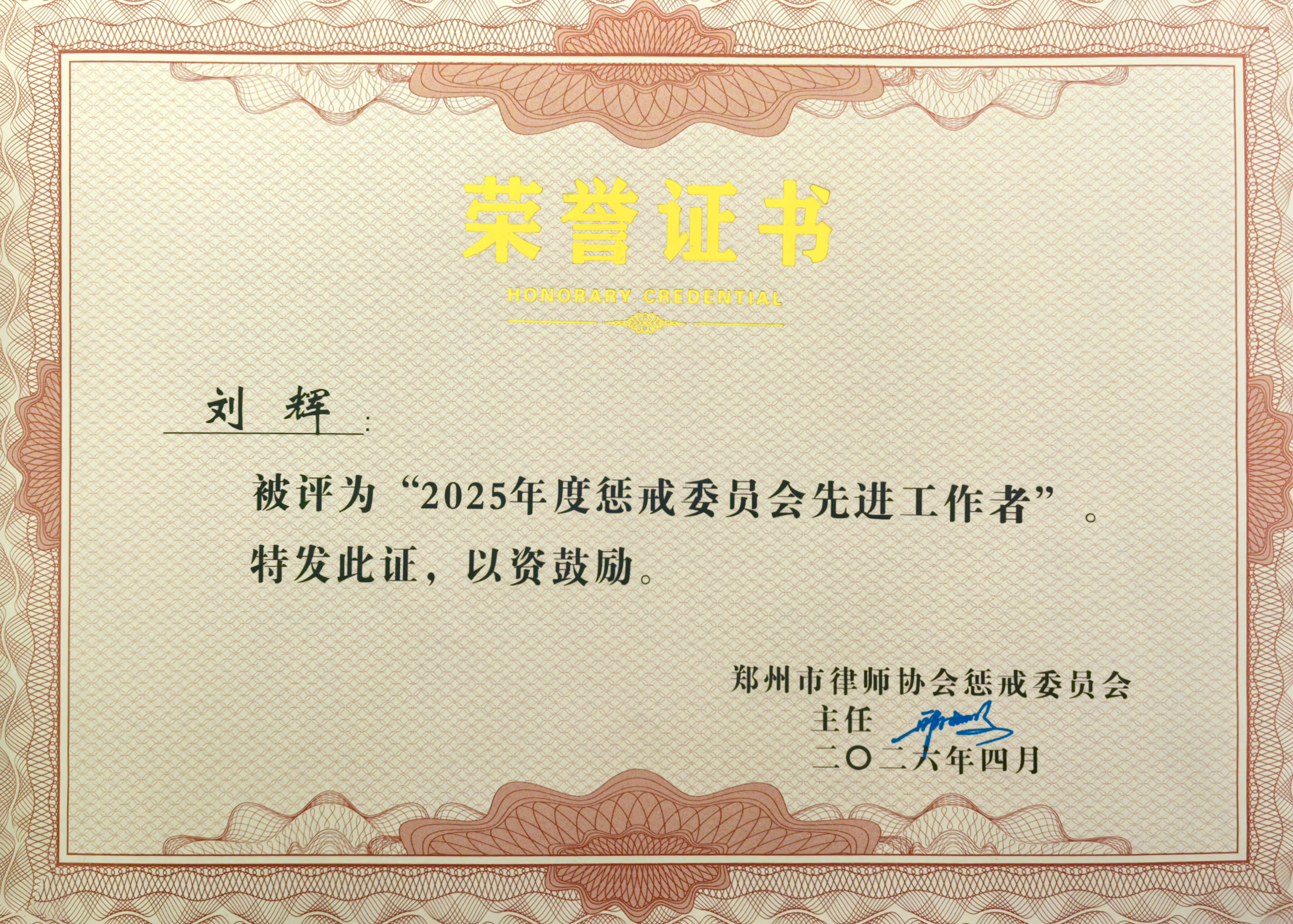 13、4月21日,河南国基律师事务所婚姻家事与财富传承部主任刘辉律师被郑州市律师协会惩戒委员会表彰为“2025年度惩戒委员会先进工作者”。