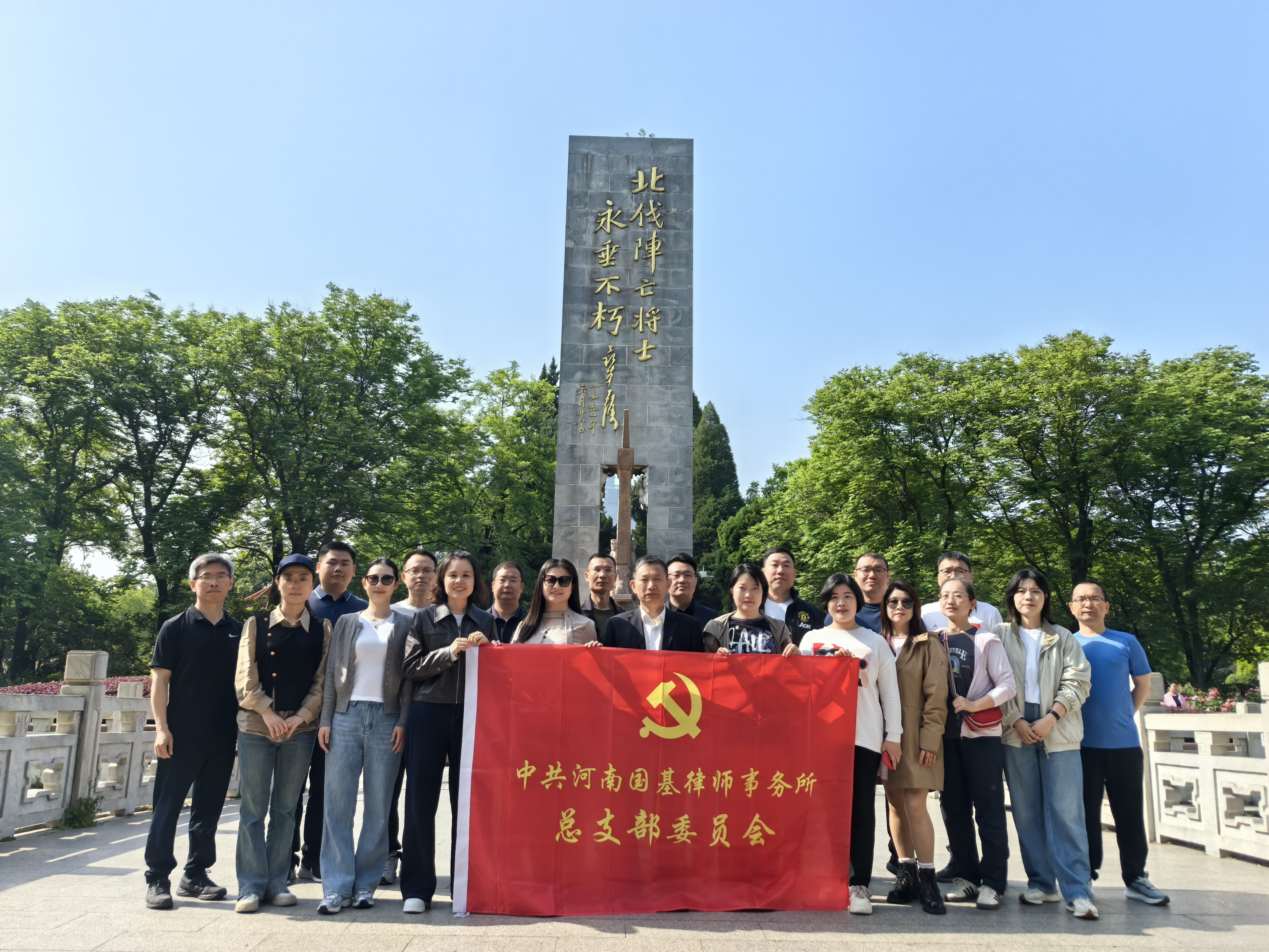 18、4月25日,为传承红色基因、厚植家国情怀,增强团队向心力、凝聚力,河南国基律师事务所党总支第二党支部、第五党支部组织部分党员律师,前往郑州市碧沙岗公园,瞻仰北伐阵亡将士纪念碑、碧血丹心碑亭等红色地标,开展红色教育与团队建设主题党日活动。