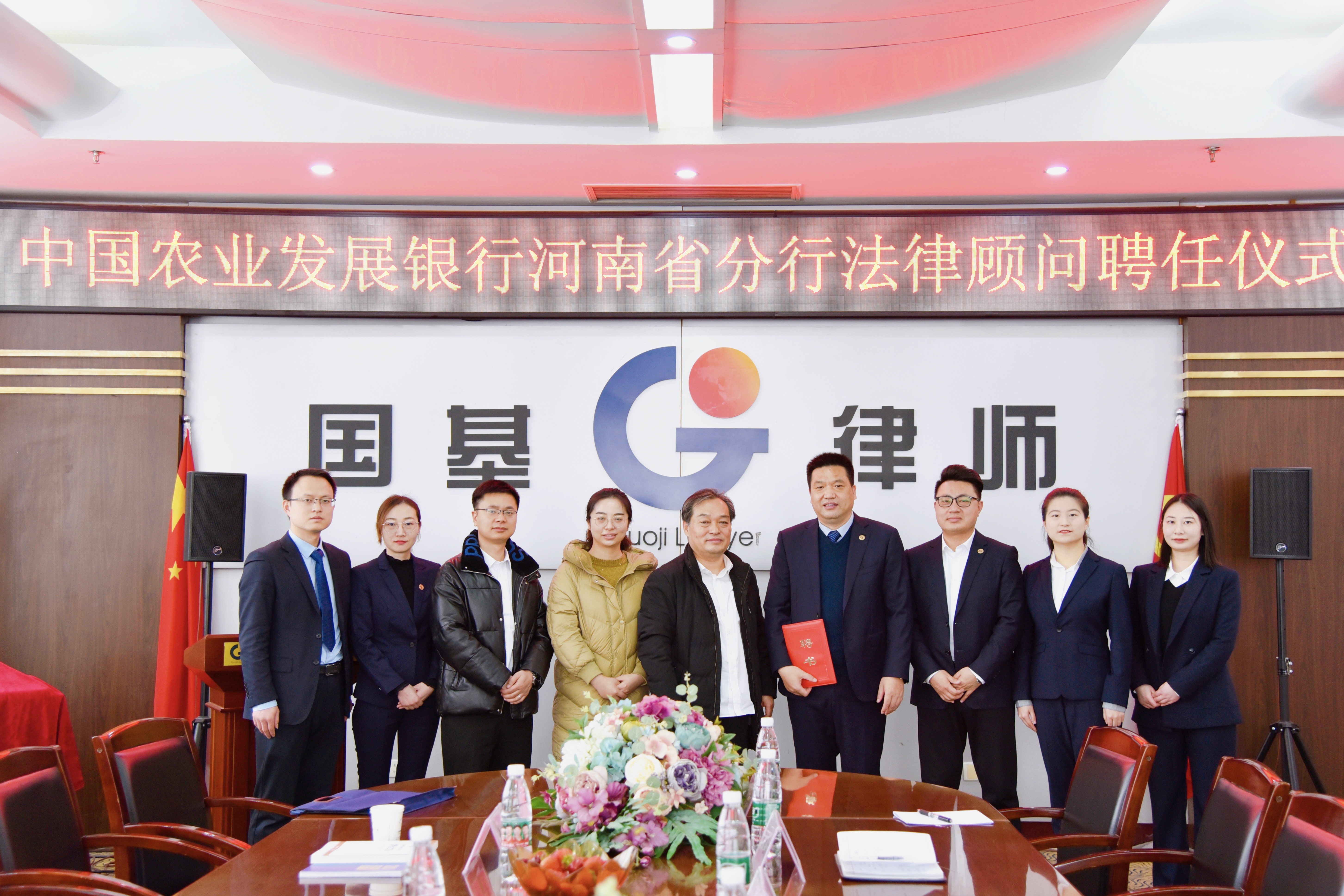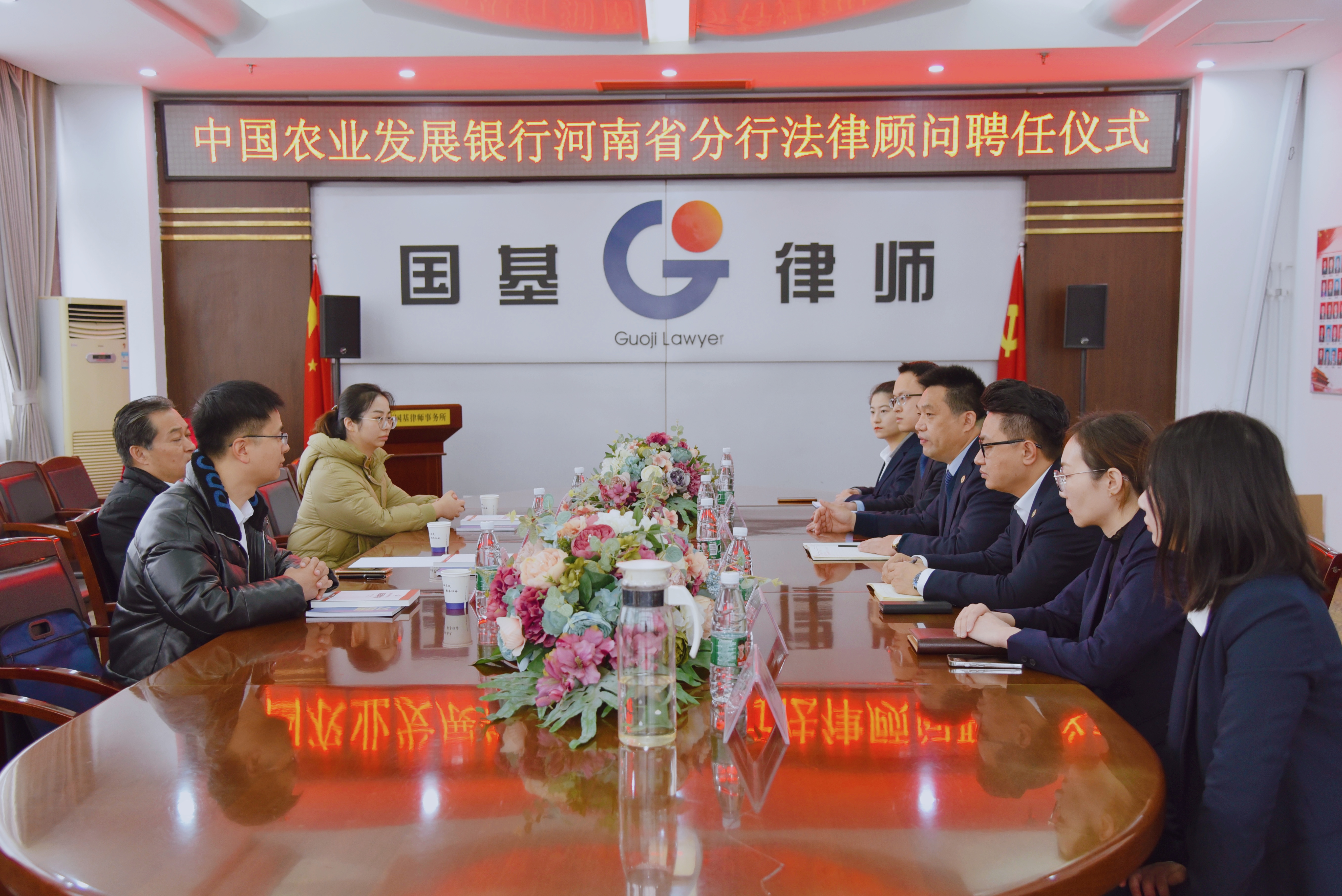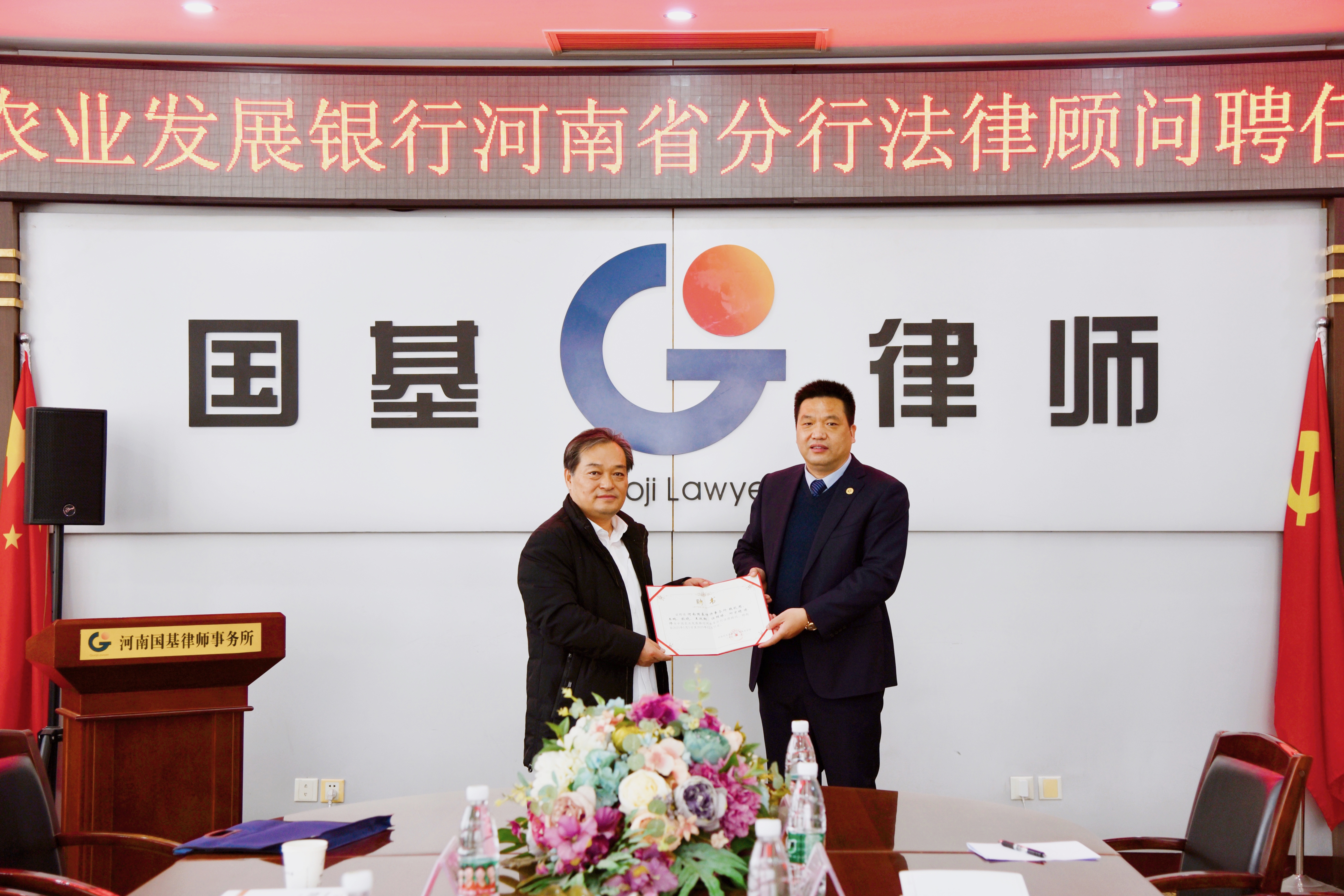 2023年2月10日上午,中国农业发展银行河南省分行法律顾问聘任仪式在河南国基律师事务所第一会议室举行。农发行河南省分行正式聘请河南国基律师事务所高级合伙人、副主任魏杭周,民事部主任王鹏及青年律师耿晓、王政翔、任理婷、邱京晴为农发行河南省分行常年法律顾问。农发行河南省分行法律合规处副处长王华、合规经理李飒、杨宏泽出席此次聘书颁发仪式。仪式由国基所高级合伙人、副主任魏杭周主持。