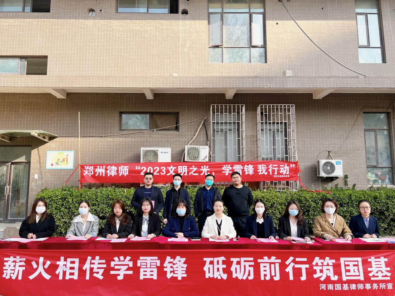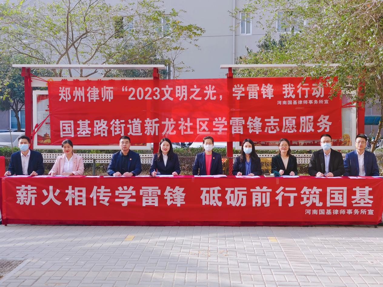 3月5日上午,在第60个学雷锋纪念日到来之际,为大力弘扬“奉献、友爱、互助、进步”的志愿服务精神,营造学雷锋浓厚氛围,展现新时代律师风貌,践行为民办实事的服务宗旨,河南国基律师事务所走进郑州市新龙社区、郑花社区,开展“学雷锋争当法治`排头兵`义务法律宣传活动”。