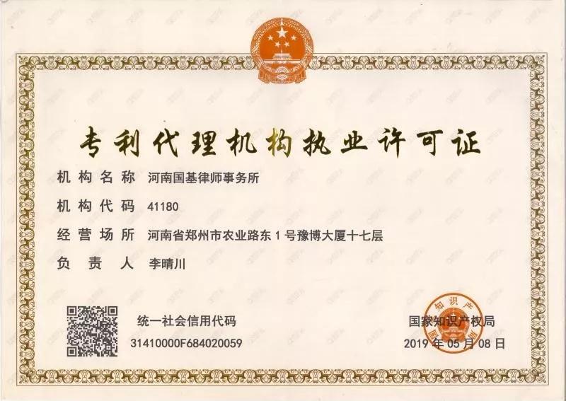 日前,经国家知识产权局审批,河南国基律师事务所取得专利代理机构执业许可证,成为具有提供法律服务和专利代理服务的多资质综合性律师事务所。