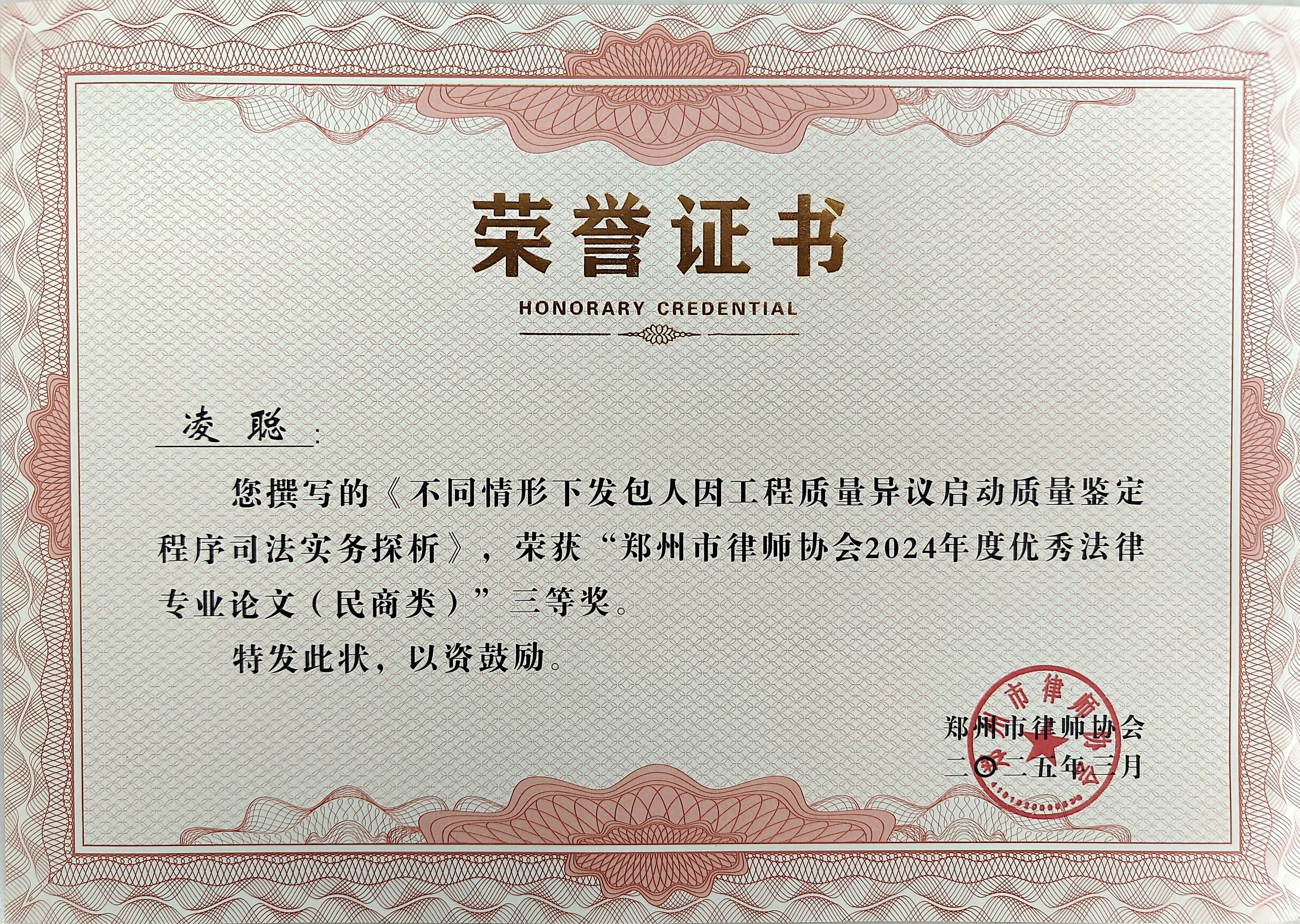 7、4月9日,河南国基律师事务所建筑与房地产法律事务部副主任凌聪律师撰写的《不同情形下发包人因工程质量异议启动质量鉴定程序司法实务探析》论文,荣获郑州市律师协会“2024年度优秀法律专业论文”三等奖。