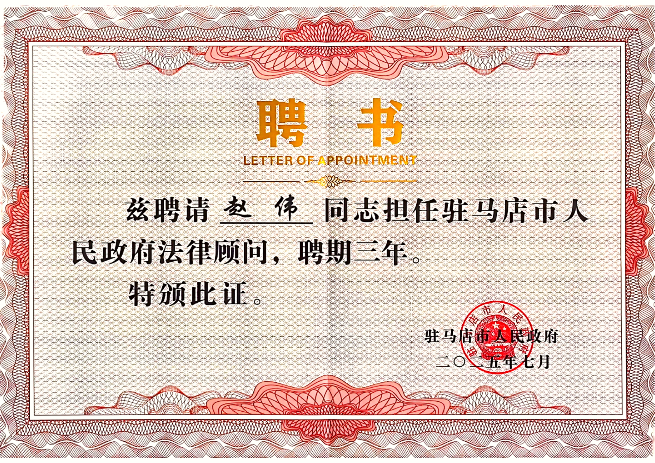 1、10月1日,河南国基(驻马店)律师事务所主任赵伟被驻马店市人民政府聘请为法律顾问。