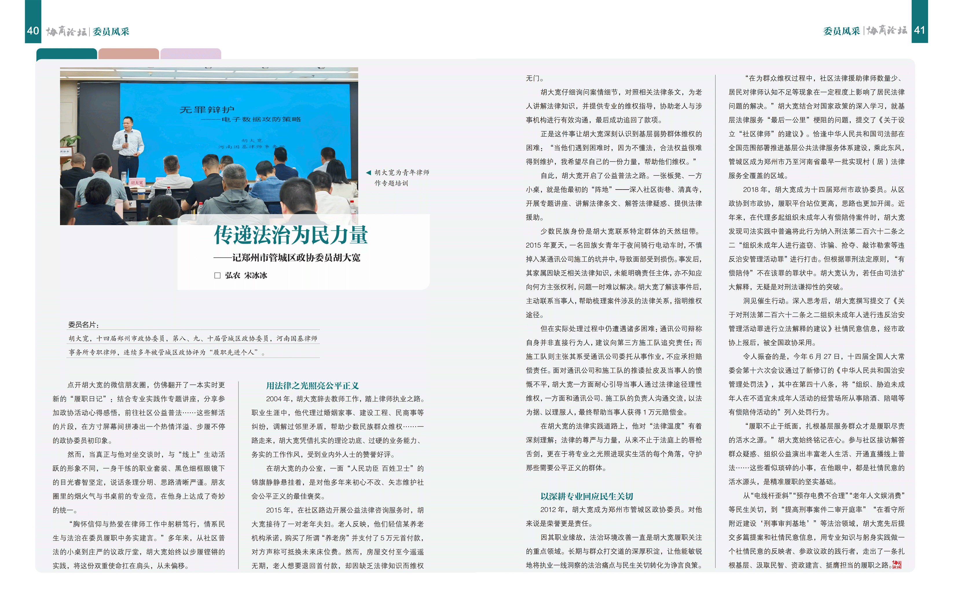 6、10月12日,由政协河南省委员会主管主办的《协商论坛》月刊,刊发专栏文章《传递法治为民力量——记郑州市管城区政协委员胡大宽》,对河南国基律师事务所乡村振兴法律服务中心主任胡大宽律师的事迹进行了专题报道。