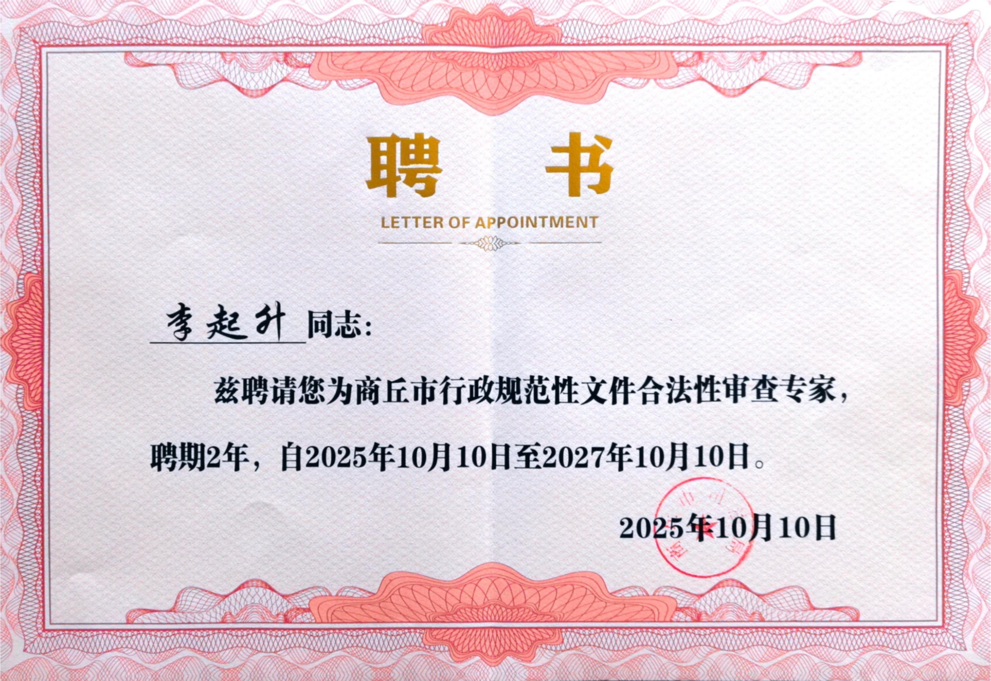 9、10月16日,商丘市行政规范性文件合法性审查专家聘任仪式在商丘市司法局举行。河南国基(商丘)律师事务所主任李起升受聘担任商丘市行政规范性文件合法性审查专家。