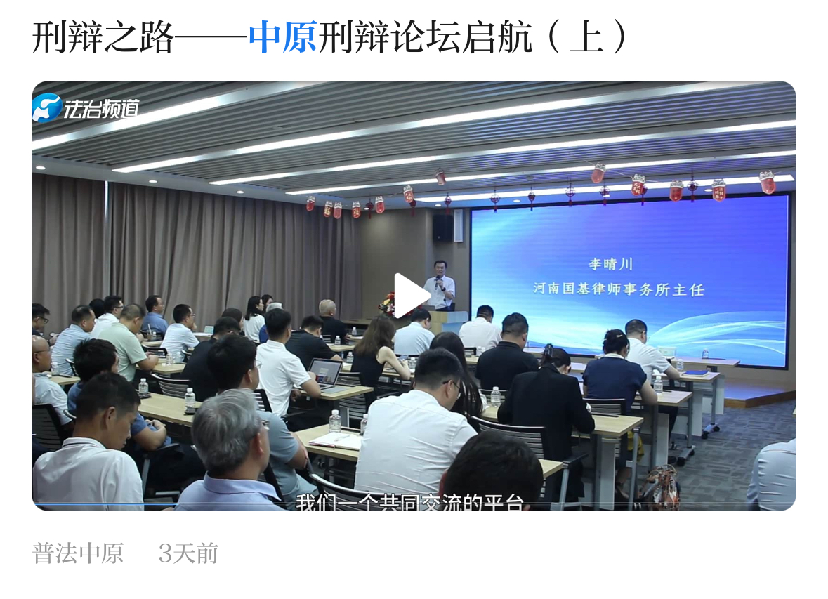 12、10月21日,河南电视台法治频道就国基刑辩研究院及中原刑辩论坛等相关工作开展情况进行采访报道,制作的节目《刑辩之路—中原刑辩论坛启航(上)》于10月26日在河南电视台法治频道播出。