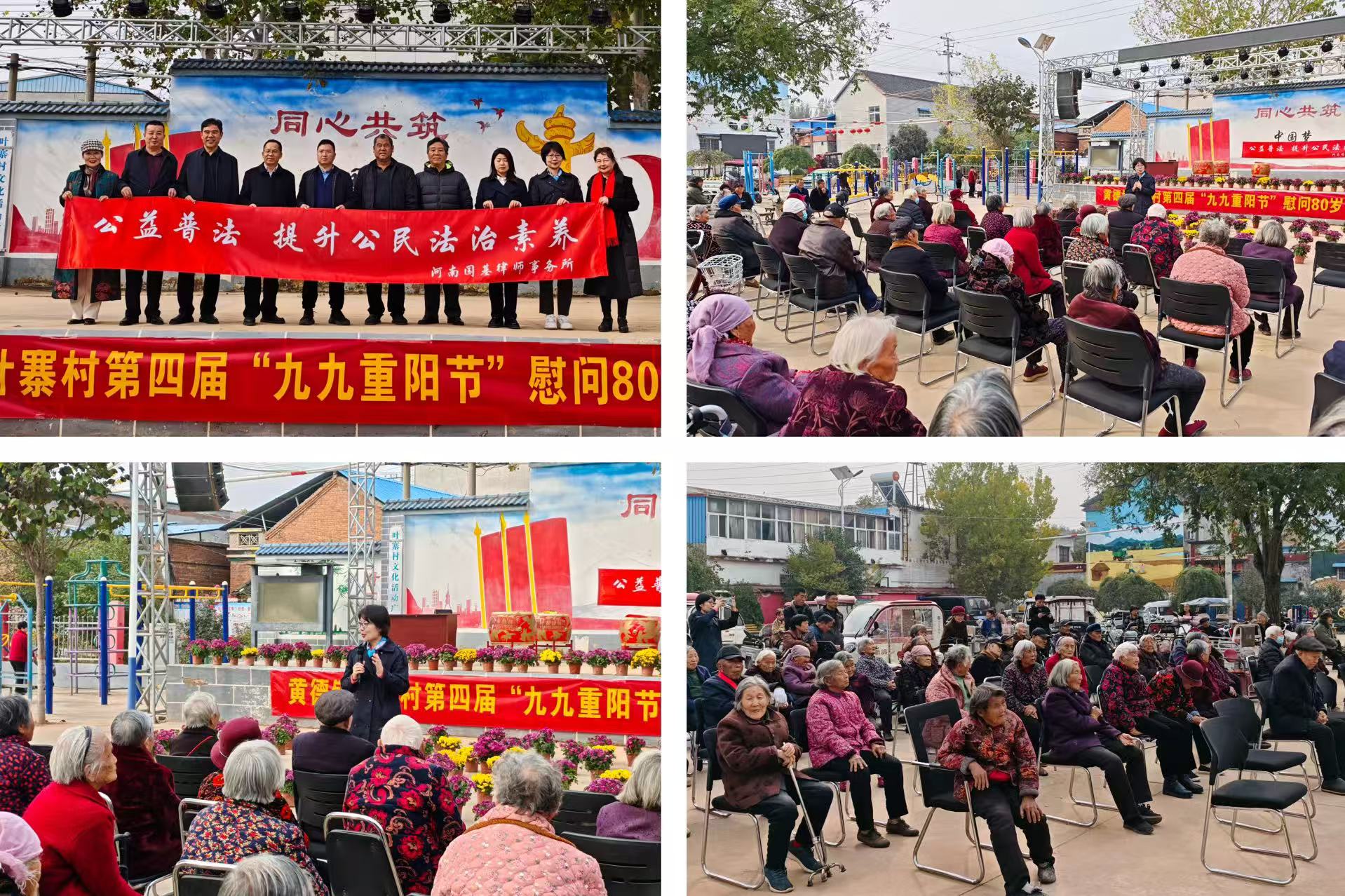 18、10月29日重阳节,河南国基律师事务所胡大宽、裴建奎、雷雅景、张银丽四位律师赴新乡市封丘县黄德镇叶寨村,为当地老人进行普法活动。律师们就彩礼、居住权、电信诈骗、遗产继承等与老年群体密切相关的法律问题进行讲解,并献上歌曲与节日祝福,为老年群体带来欢乐并为他们的合法权益提供咨询。