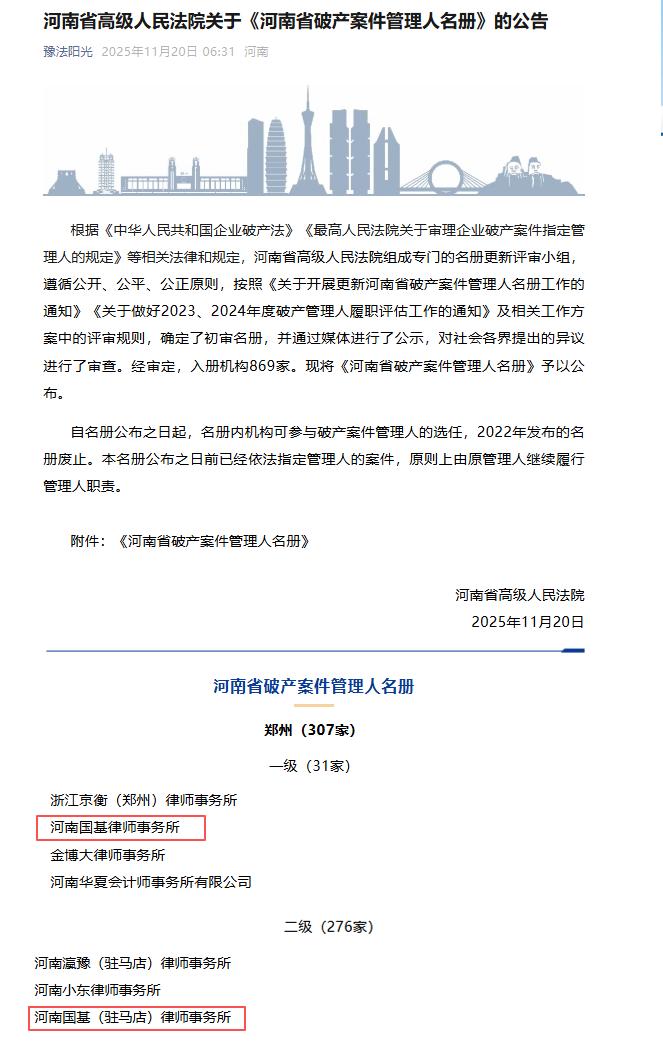 11月20日,河南省高级人民法院正式公布《河南省破产案件管理人名册》,河南国基律师事务所凭借扎实的专业能力和丰富的破产业务经验荣获破产案件一级管理人资质,成功入选“河南省破产案件一级管理人名册”,河南国基(驻马店)律师事务所入选“河南省破产案件二级管理人名册”。这一资质及荣誉的取得体现了国基律所在破产业务方面的专业实力,标志着国基律所在企业破产重整、清算等领域的专业水平居于全省优势地位。