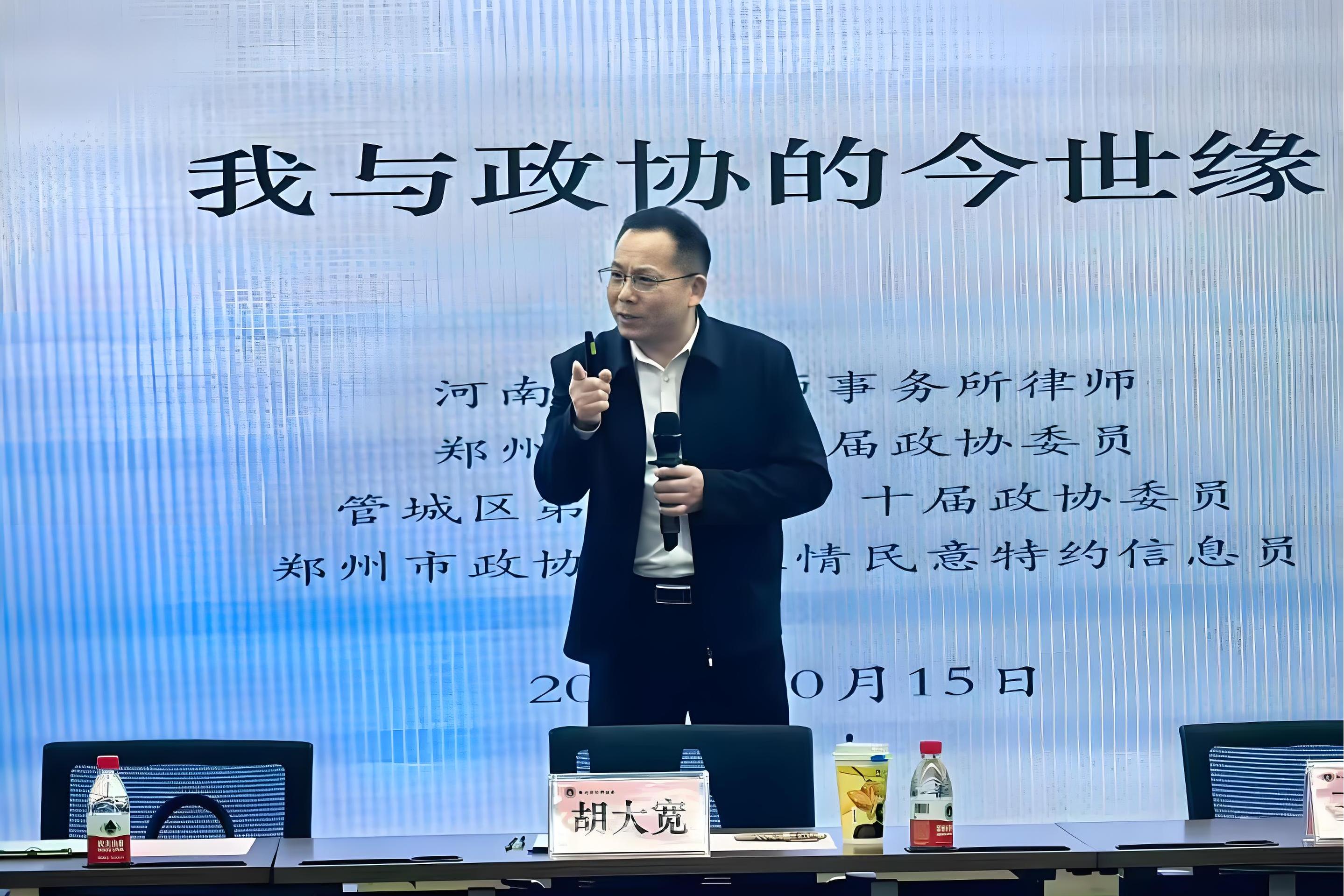 12、11月15日,郑州市律师协会参政议政委员会在市律协举办“参政议政能力素养培训暨立法咨询服务基地和人大代表政协委员工作室揭牌仪式”。在经验交流环节,管城区政协常委、河南国基律师事务所律师胡大宽以《我与政协的今世缘》为题进行分享。