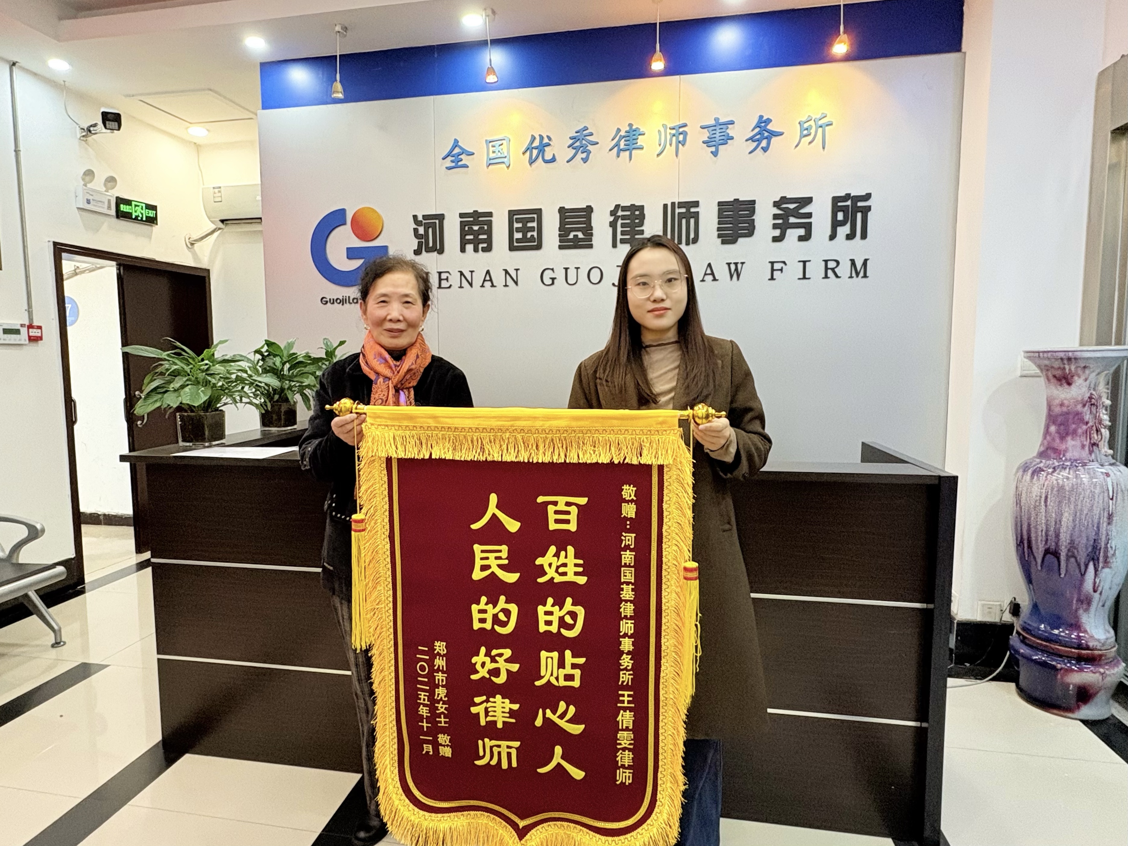 18、11月20日,委托人为河南国基(上海)律师事务所王倩雯律师送来锦旗。委托人涉及一起离婚纠纷案,王律师认真研判案情,厘清案件事实。在委托人的三次诉讼中,王律师均不负所托,维护了老年人的合法权益,彰显了公平正义。委托人专程送来锦旗表示感谢!
