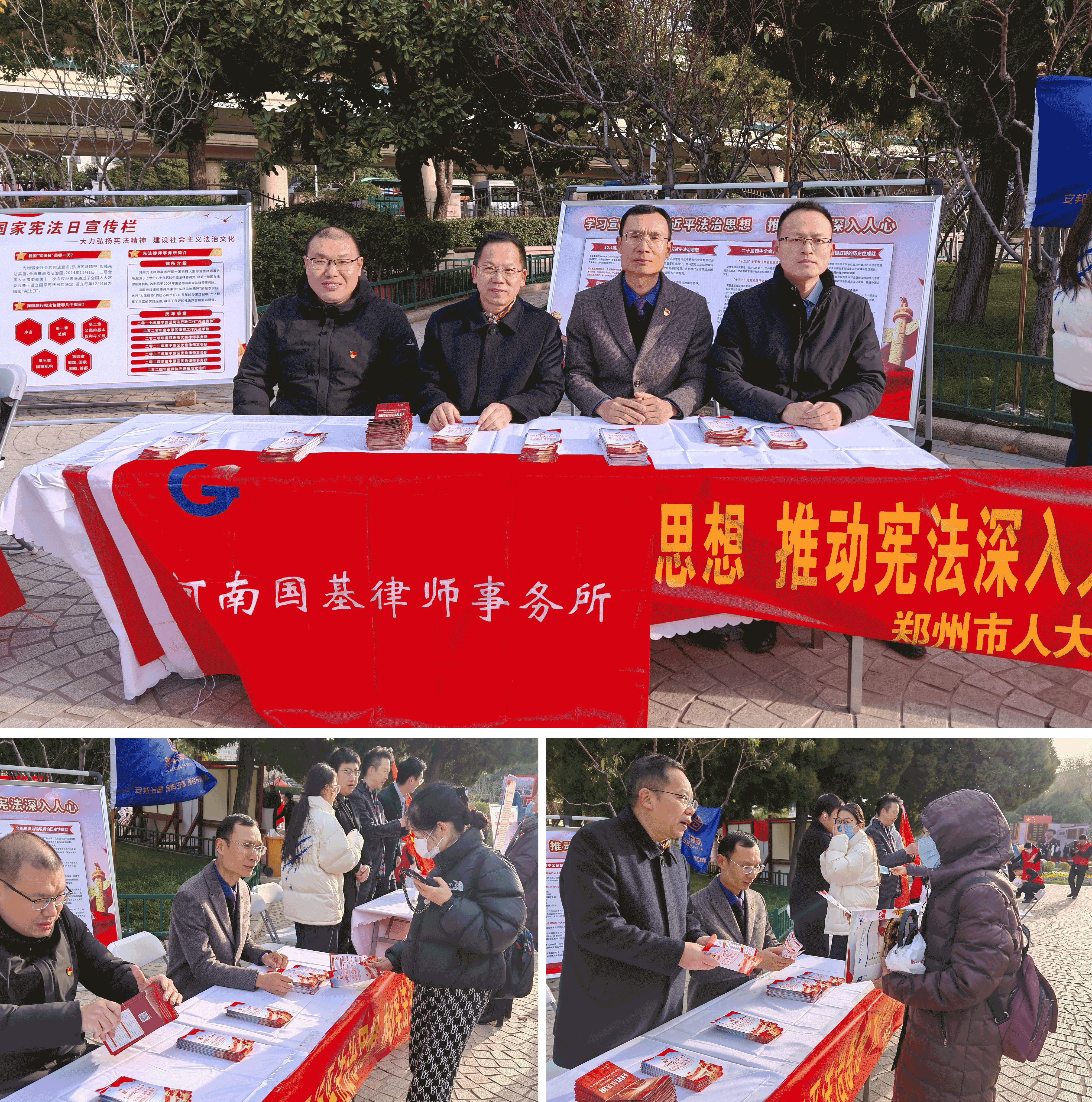 为深入贯彻党的二十届四中全会精神,加强宪法学习宣传,让法治精神深入人心,12月2日,在第十二个国家宪法日来临之际,河南国基律师事务所组织胡大宽、许水征、喻濛、王政翔四位律师前往郑州市紫荆山公园,参加由郑州市人大常委会、市司法局与市律师协会联合主办的“宪法宣传周”活动。活动现场,律师们围绕宪法中群众关心的法律问题提供专业咨询,以专业力量传递法治温度,让宪法精神融入群众日常生活。