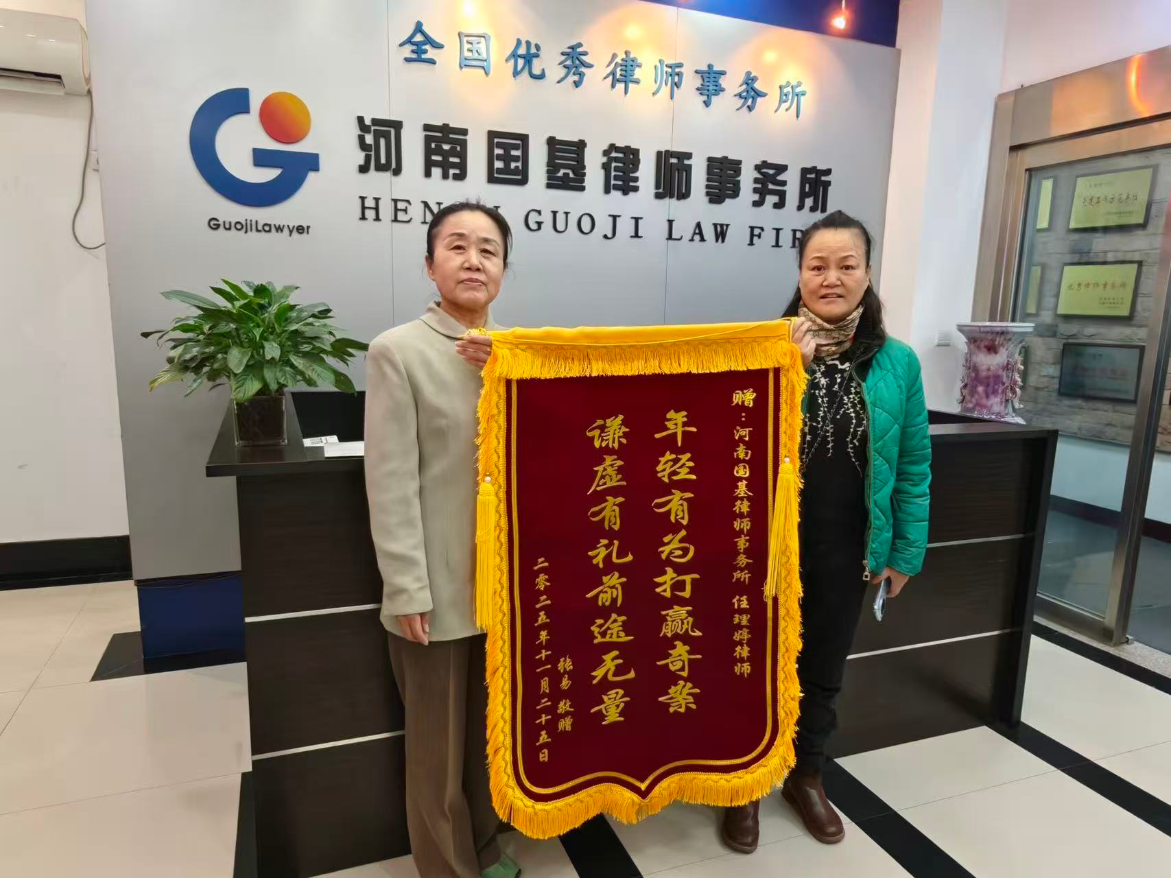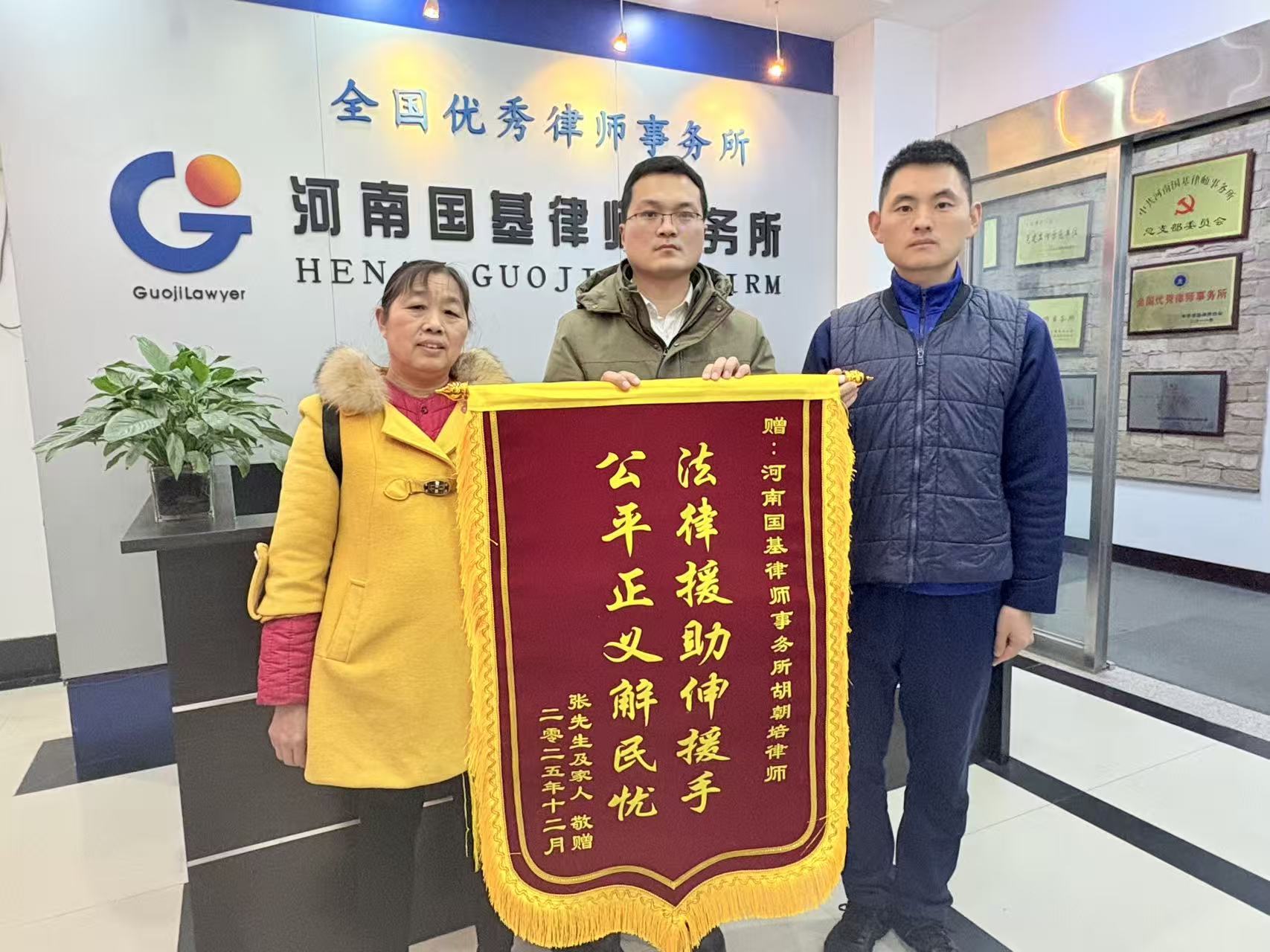 15、12月17日,当事人张先生为河南国基律师事务所民事一部胡朝培律师送来锦旗致谢!郑州某消防员张先生的父亲在工地受伤后维权困难,胡律师得知后主动伸出法律援助之手,无偿提供专业法律支持,案件取得圆满结果,当事人专程送来锦旗,向胡朝培律师的公益善举表示感谢!