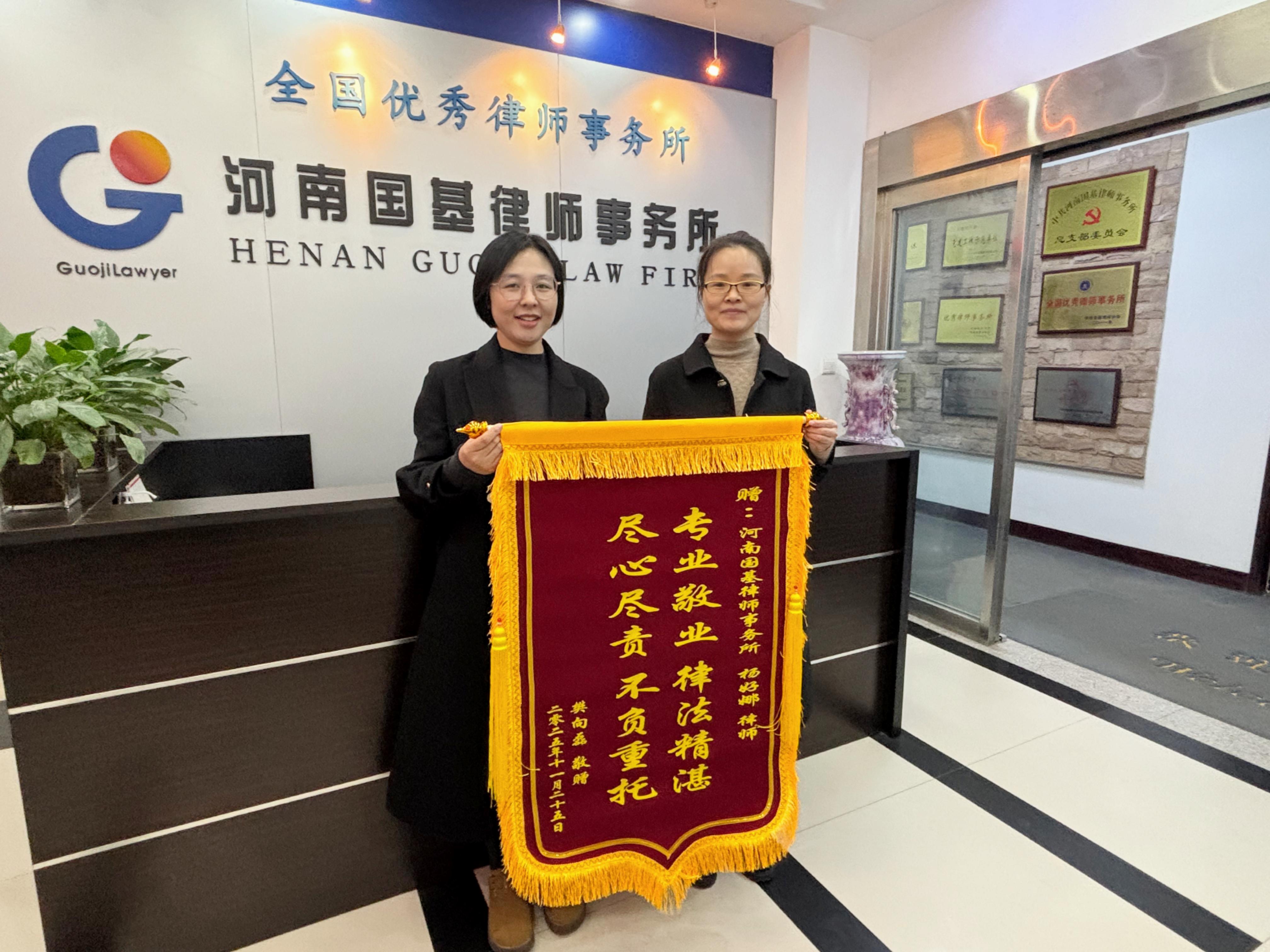 7、12月9日,河南国基律师事务所民事一部任理婷律师收到委托人送来的锦旗。委托人涉及一起变更监护人纠纷案,原审败诉,异议程序中委托任律师代理。任律师认真研判案情,厘清案件事实,在这起少见的适用特别程序的案件上,突破法律适用难点,最终使案件改判,维护了委托人的合法权益。