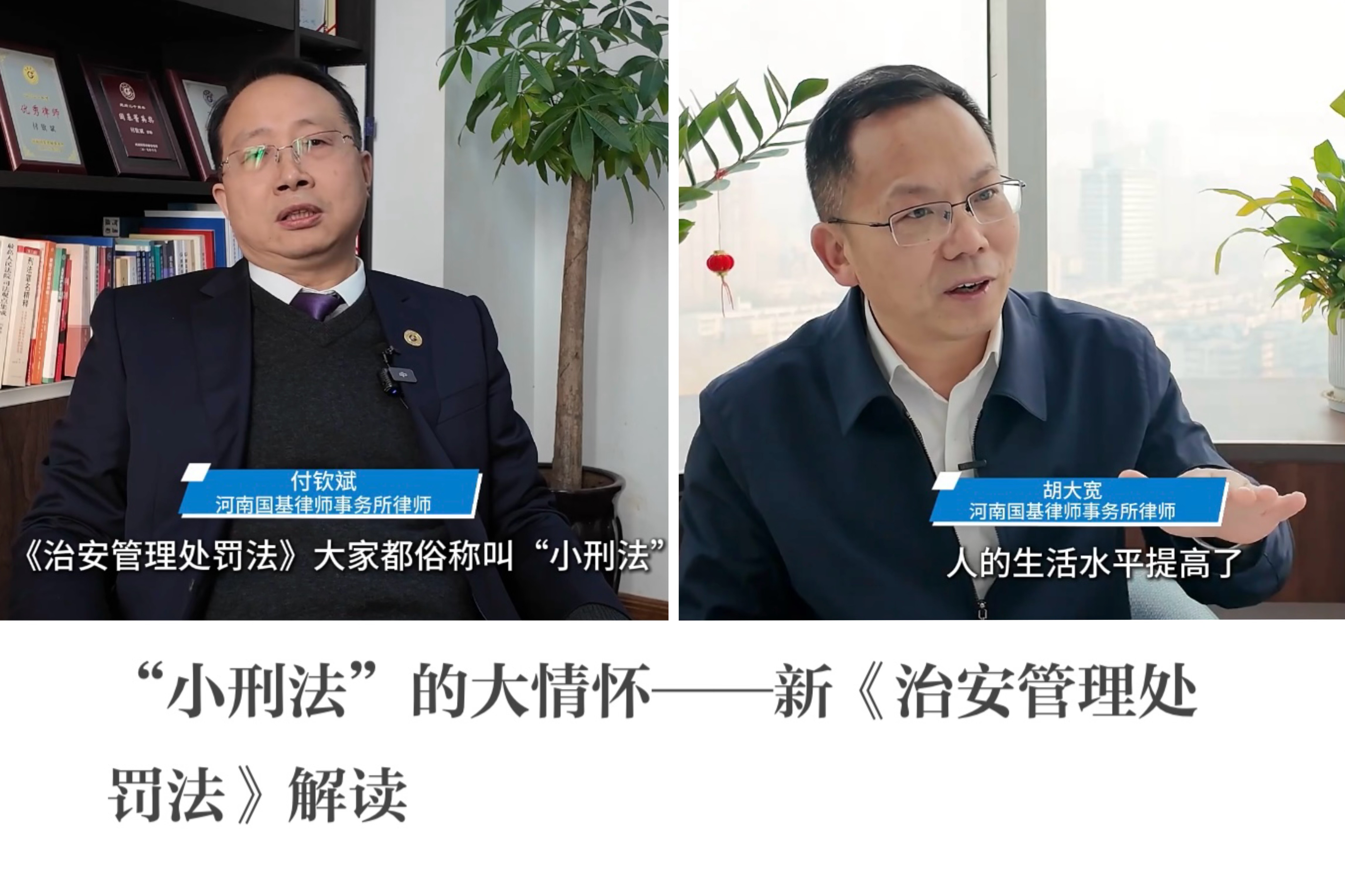 11、12月14日,河南电视台法治频道邀请河南国基律师事务所刑事二部主任付钦斌律师、乡村振兴法律服务中心主任胡大宽律师深入解读新《治安管理处罚法》,拍摄制作的节目《“小刑法”的大情怀——新“治安管理处罚法”解读》在河南电视台法治频道播出。