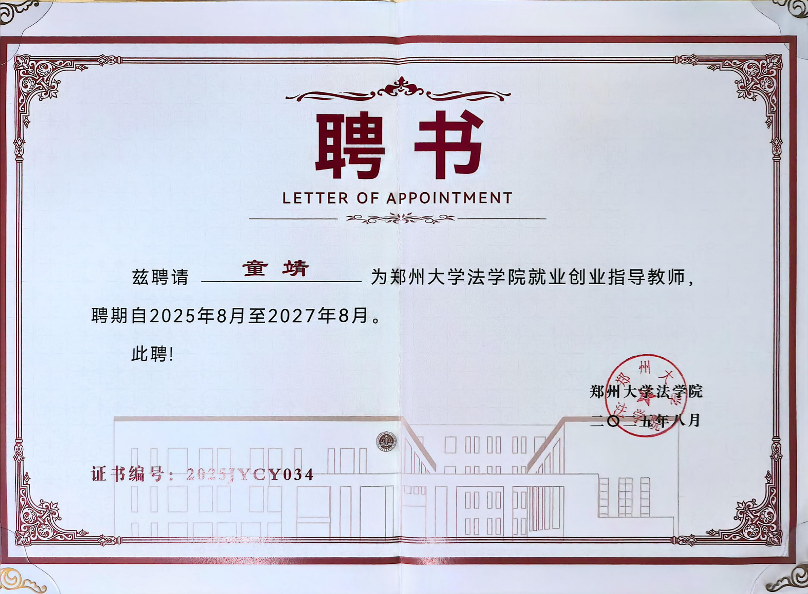 18、12月19日,郑州大学法学院2025年就业创业指导教师聘任仪式在郑州大学举行。河南国基律师事务所高级合伙人、副主任童靖受聘担任郑州大学法学院就业创业指导教师。