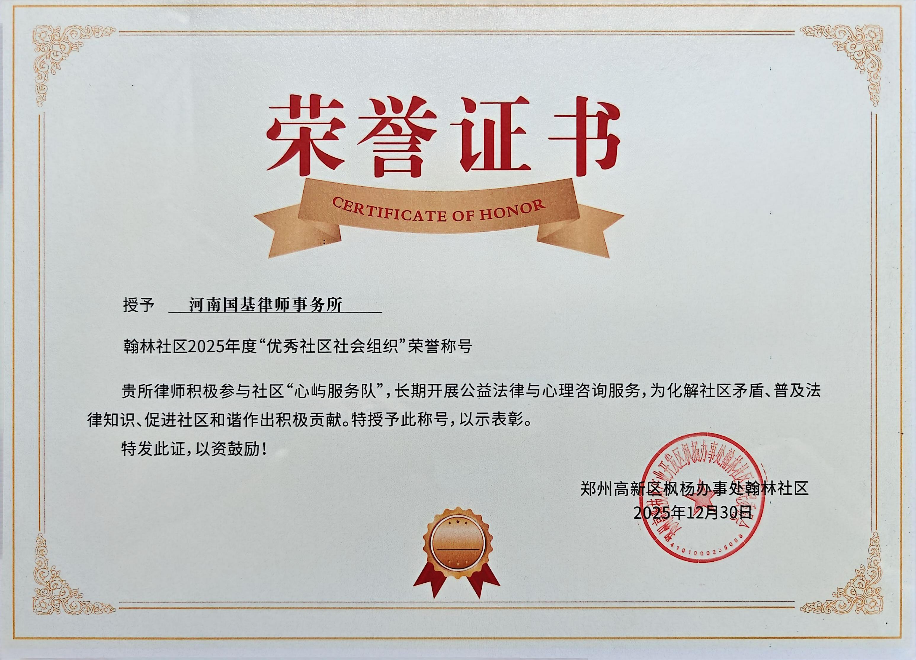 25、12月30日,河南国基律师事务所高新区公益法律服务团队获评翰林社区2025年度“优秀社区社会组织”荣誉称号。2025年1月至12月,律所婚姻家事与财富传承部主任刘辉律师带领姚艳君、薛婷婷、喻威华、杨文创、董红林五位律师,在郑州高新区秋雅社区、翰林社区开展全年公益法律服务。郑州高新区相关部门高度评价国基律师严谨认真的工作作风、良好的专业水准与品牌口碑。