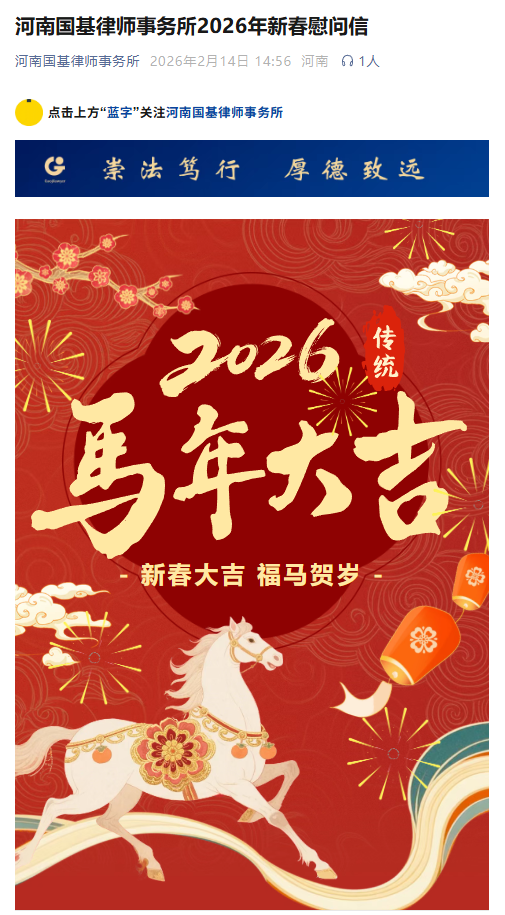 9、2月14日,河南国基律师事务所向全体员工及家属发出新春慰问信,对全所律师、实习人员、工作人员及家属过去一年的辛勤付出与大力支持表示感谢,充分肯定大家为律所发展作出的贡献,并致以新年问候与美好祝福。