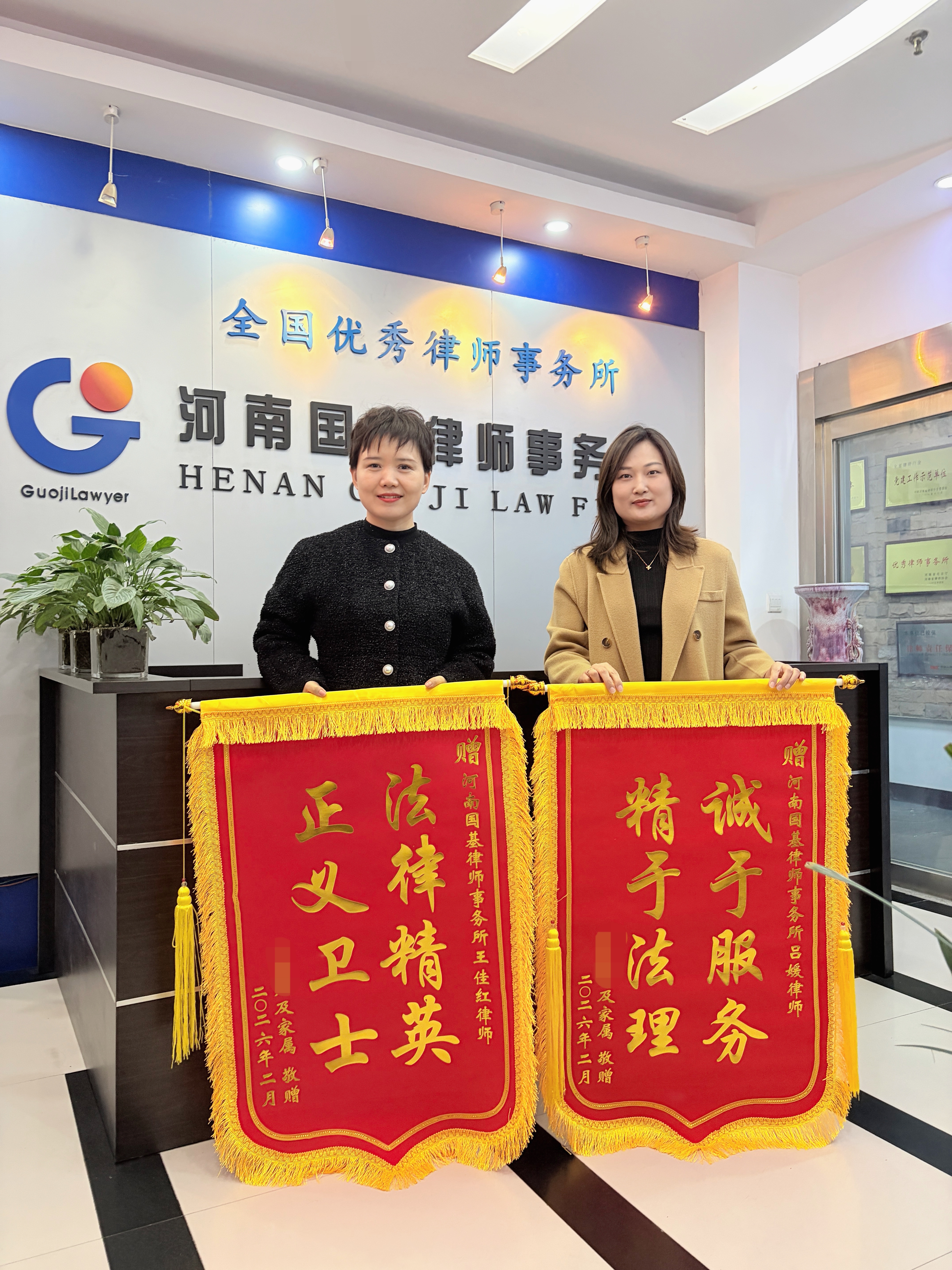 2、3月3日,委托人专程来所为河南国基律师事务所企业合规部主任王佳红博士、刑事二部副主任吕媛律师送上锦旗致谢。委托人家属被控养老金诈骗罪,案涉金额巨大,在当地有一定影响。经王佳红博士、吕媛律师辩护,当事人减少了近八年刑期,减少七万元罚金,获得良好的辩护效果。