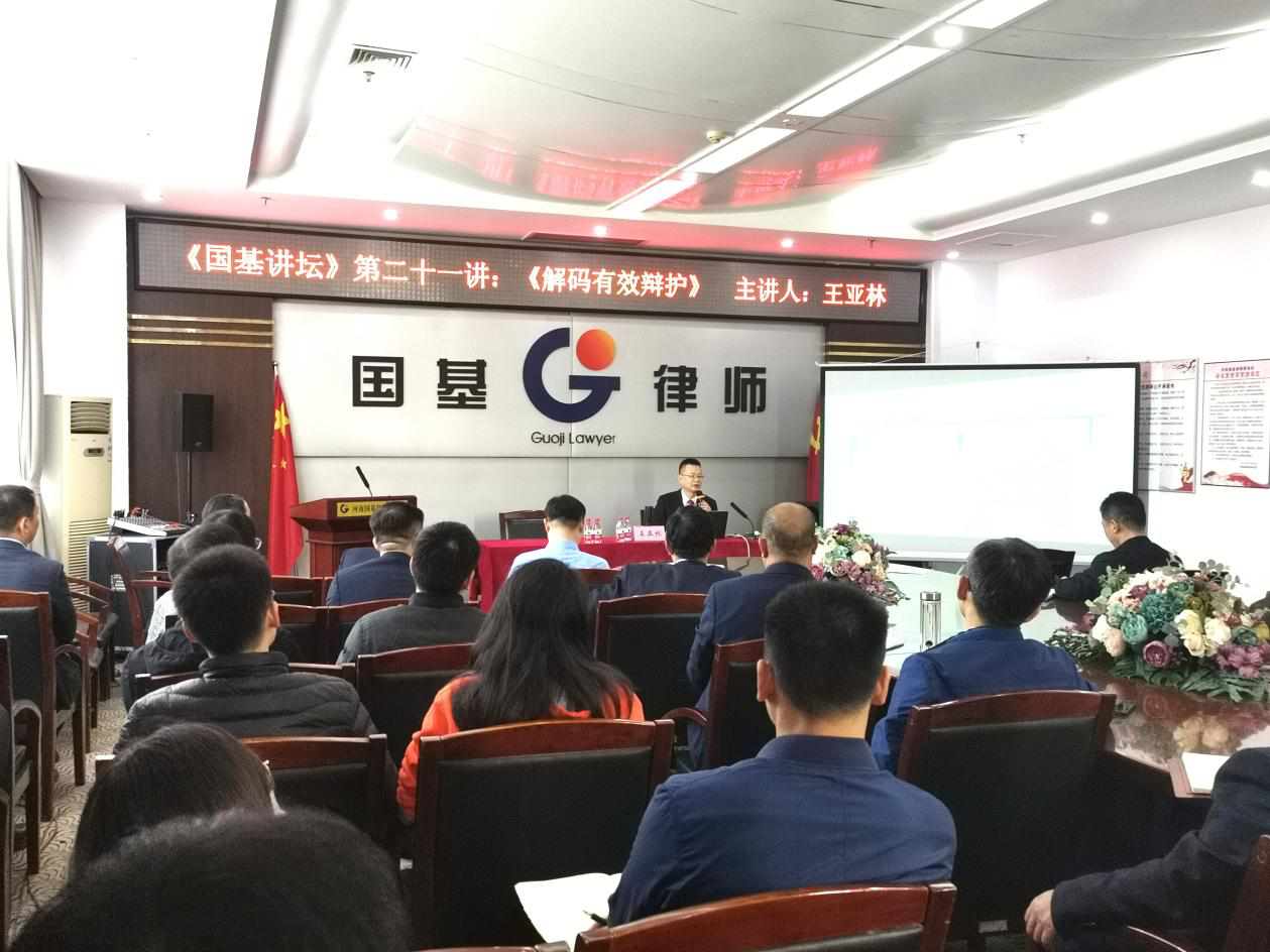2020年11月15日上午,河南国基律师事务所举办第二十一期《国基讲坛》。本次讲坛特邀安徽金亚太律师事务所管委会主任、安徽省律师协会刑事业务委员会主任、中国著名刑辩律师王亚林作《解码有效辩护》专题讲座。国基所刑事部涉黑恶犯罪研究中心主任胡大宽主持讲座,李晴川主任致欢迎词。