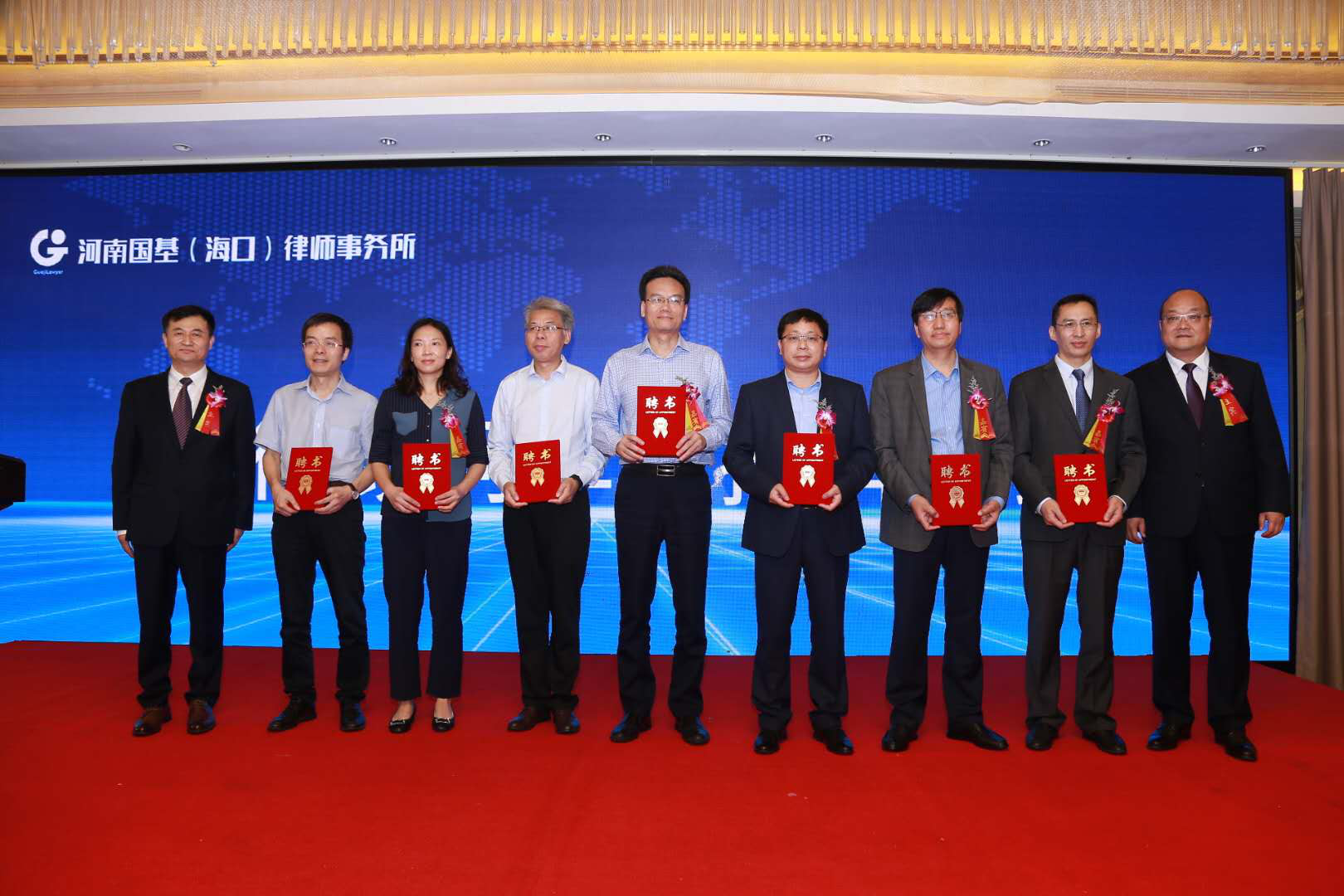 开业庆典仪式上,河南国基(海口)律师事务所向河南大学法学院院长蔡军教授,海南大学法学院院长王琦教授、郑州大学法学院副院长张嘉军教授、海南大学法学院副院长刘道远教授、河南大学法学院郑金玉教授、海南大学法学院彭真明教授、陈秋云教授、熊勇先教授、唐俐教授、刘国良教授颁发高级专家顾问聘书。河南国基律师事务所主任李晴川、河南国基(海口)律师事务所主任李钢向专家顾问颁发聘书并合影留念。