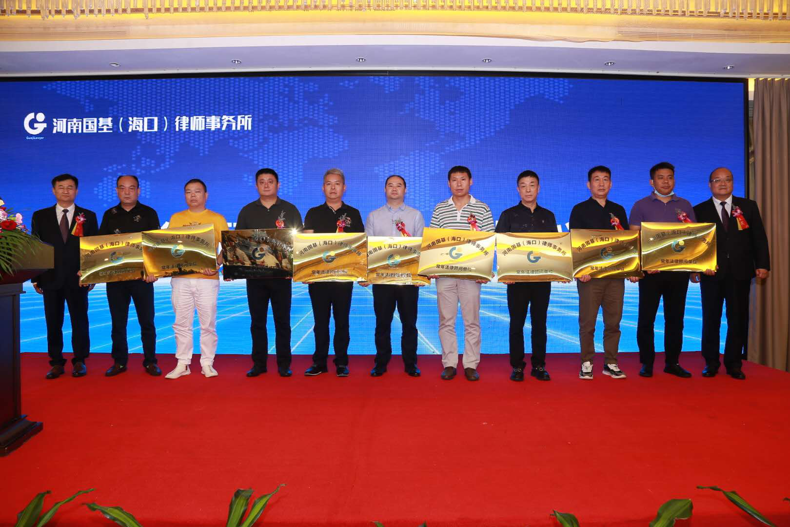 随后、河南国基律师事务所主任李晴川、河南国基(海口)律师事务所主任李钢为10家法律顾问单位授牌并合影留念。